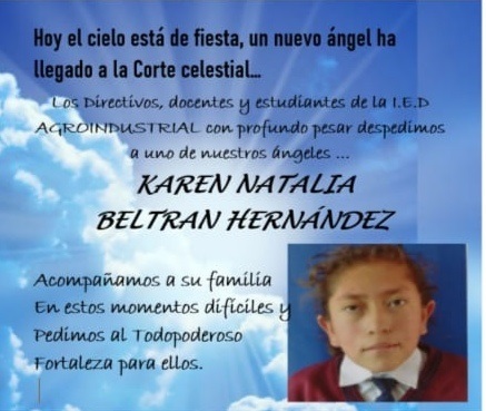 Hoy como institución queremos acompañar a la familia, amigos y docentes que compartieron con Karen Nathalia un pedacito de su vida, hoy nos acompaña desde el cielo, hagamos un alto en nuestras labores diarias para elevar una oración por el alma de Karen Nathalia, cuyo recuerdo vivirá por siempre en los corazones de sus compañeros, docentes, amigos y familiares.